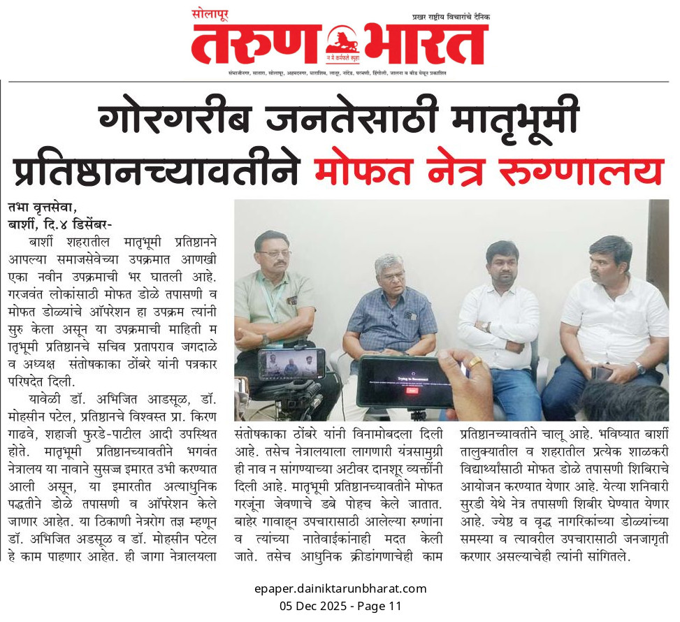 बार्शी शहरातील मातृभूमी प्रतिष्ठानने आपल्या समाजसेवेच्या उपक्रमात आणखी एका नवीन उपक्रमाची भर घातली आहे. गरजवंत लोकांसाठी मोफत डोळे तपासणी व मोफत डोळ्यांचे ऑपरेशन हा उपक्रम त्यांनी सुरु केला असून या उपक्रमाची माहिती मातृभूमी प्रतिष्ठानचे सचिव प्रतापराव जगदाळे व अध्यक्ष संतोषकाका ठोंबरे यांनी पत्रकार परिषदेत दिली.